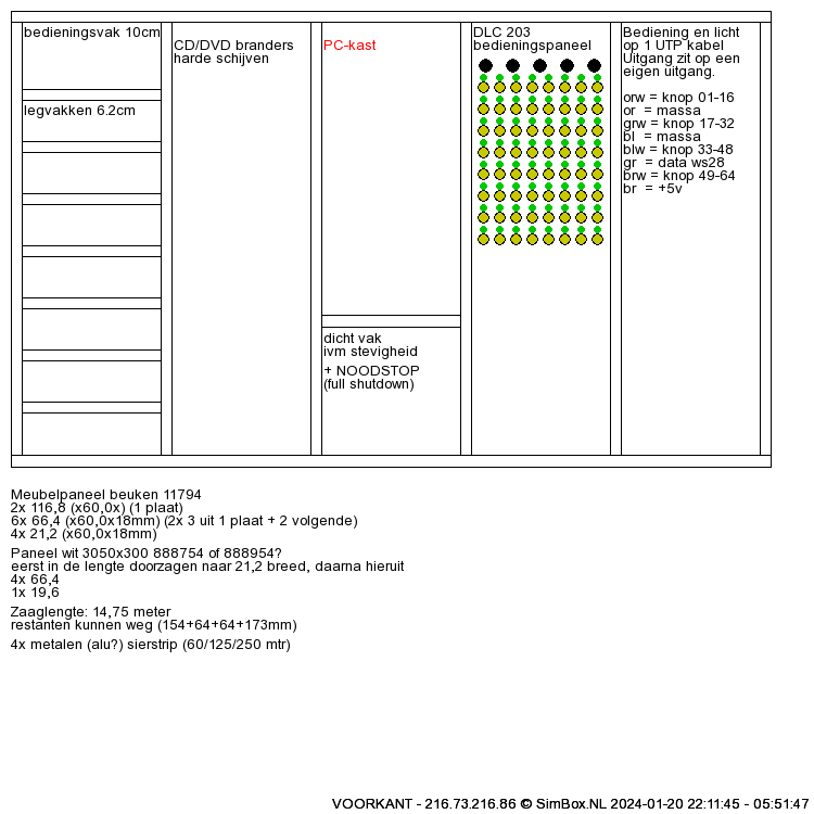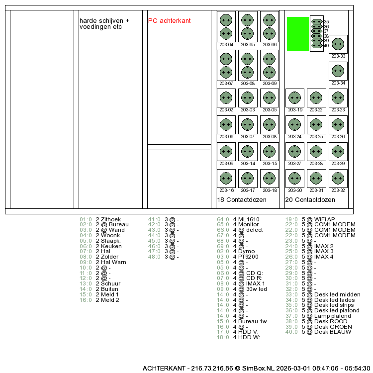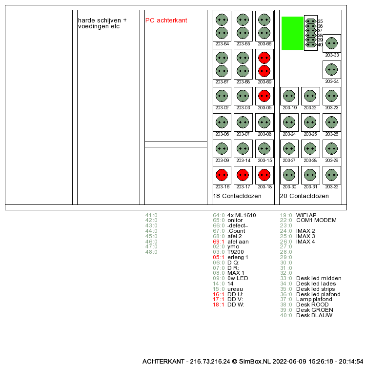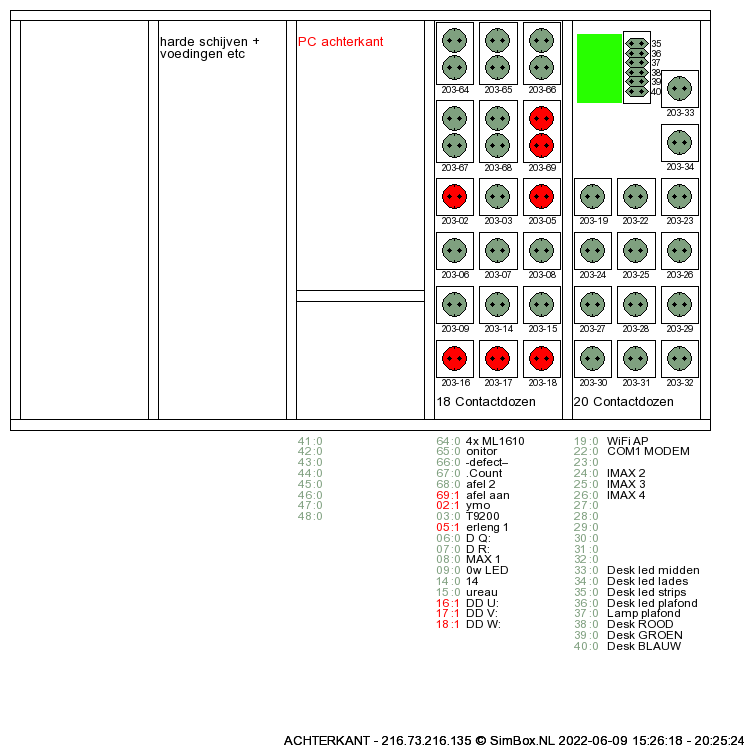 Het bouwplan hieronder laat een indeling zien waarop we later verder bouwen. Ook is in deze afbeeldingen een aantal opties groen of rood gekleurd. Dit laat de actuele status zien: ROOD = aan, groen = uit (veilig). Vragen en opmerkingen zijn welkom, bij voorkeur via